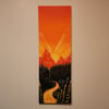 An original 12" x 36" canvas painting of the sun setting behind the mountians. Was inspired by some graphic designs recently for this one. Wanted to keep the painting to mostly simple shapes with a few paitning touches here and there.